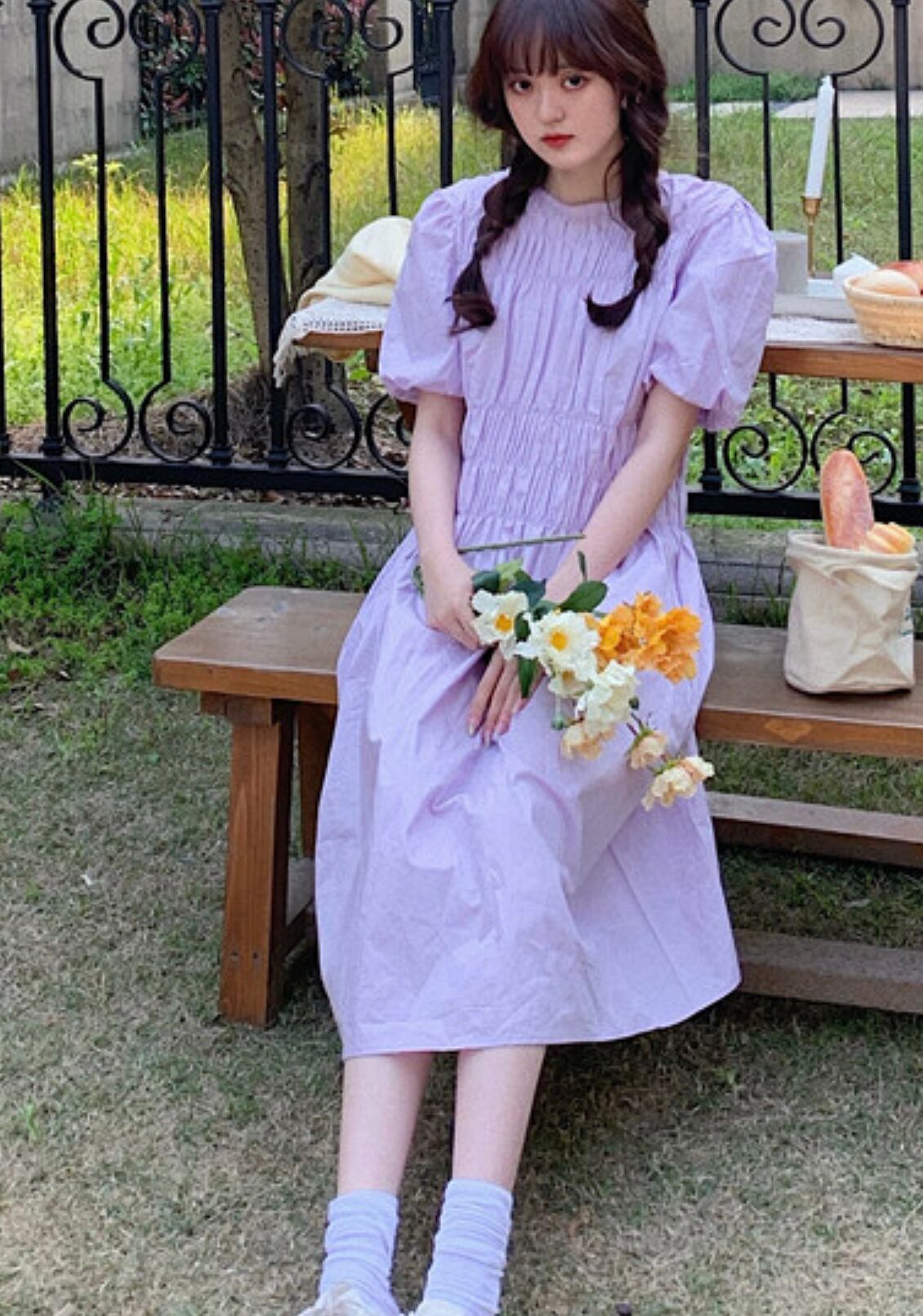 ◎shirring puffsleeve long ONE PIECE